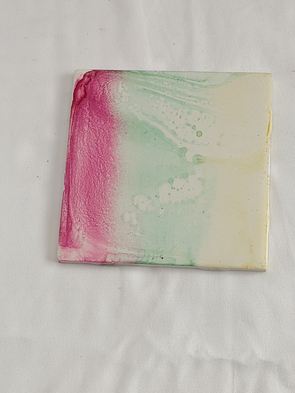These unique coasters are one of a kind. They are "uniquely matching" tiles, which means, the colors are the same but the process of crafting them makes them each turn out slightly different. How unique!! Each coaster is a 4"x4" tile with a cork bottom to protect the table.