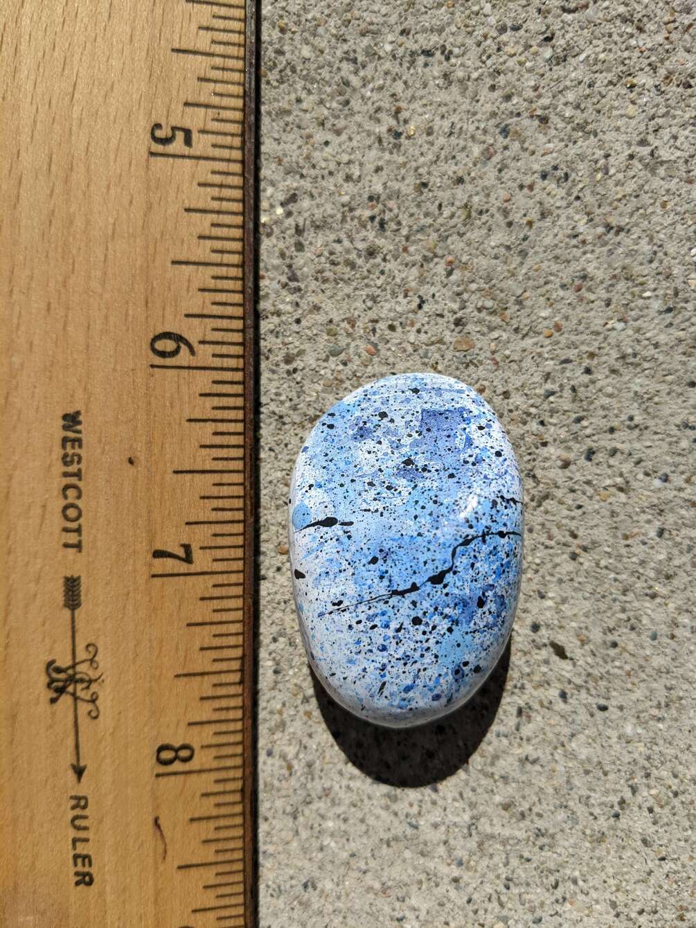 This rock is really nice it has blue and black splatters all over it. It is really small it is 1 inch wide and 2 inches tall. If you buy this rock it will come with the NFT that I created.